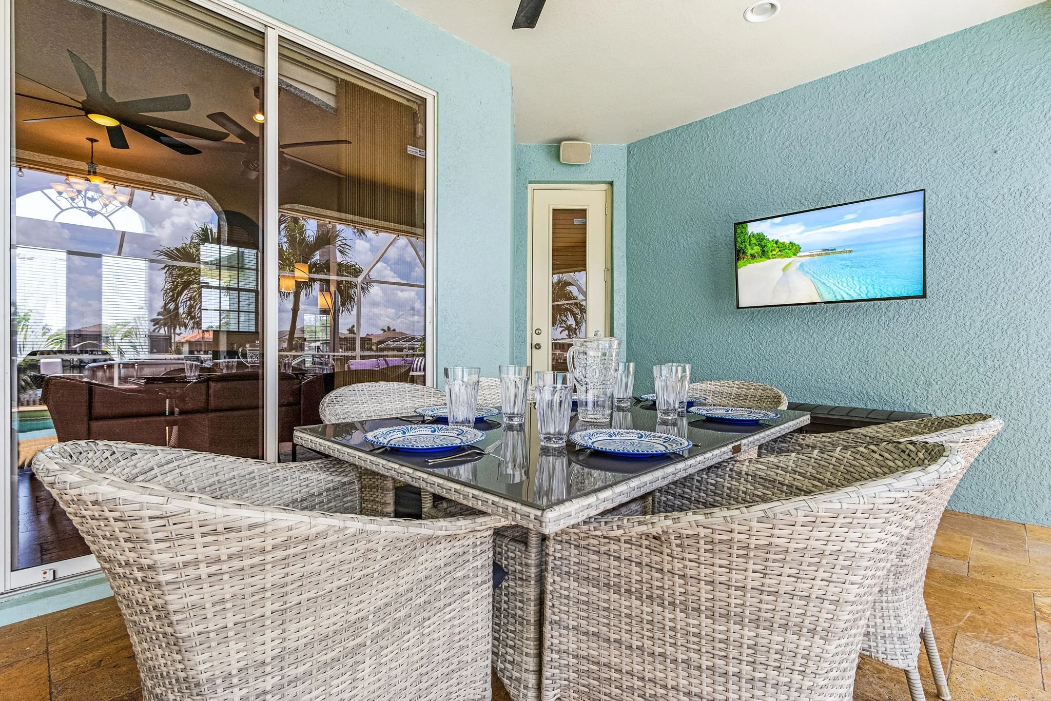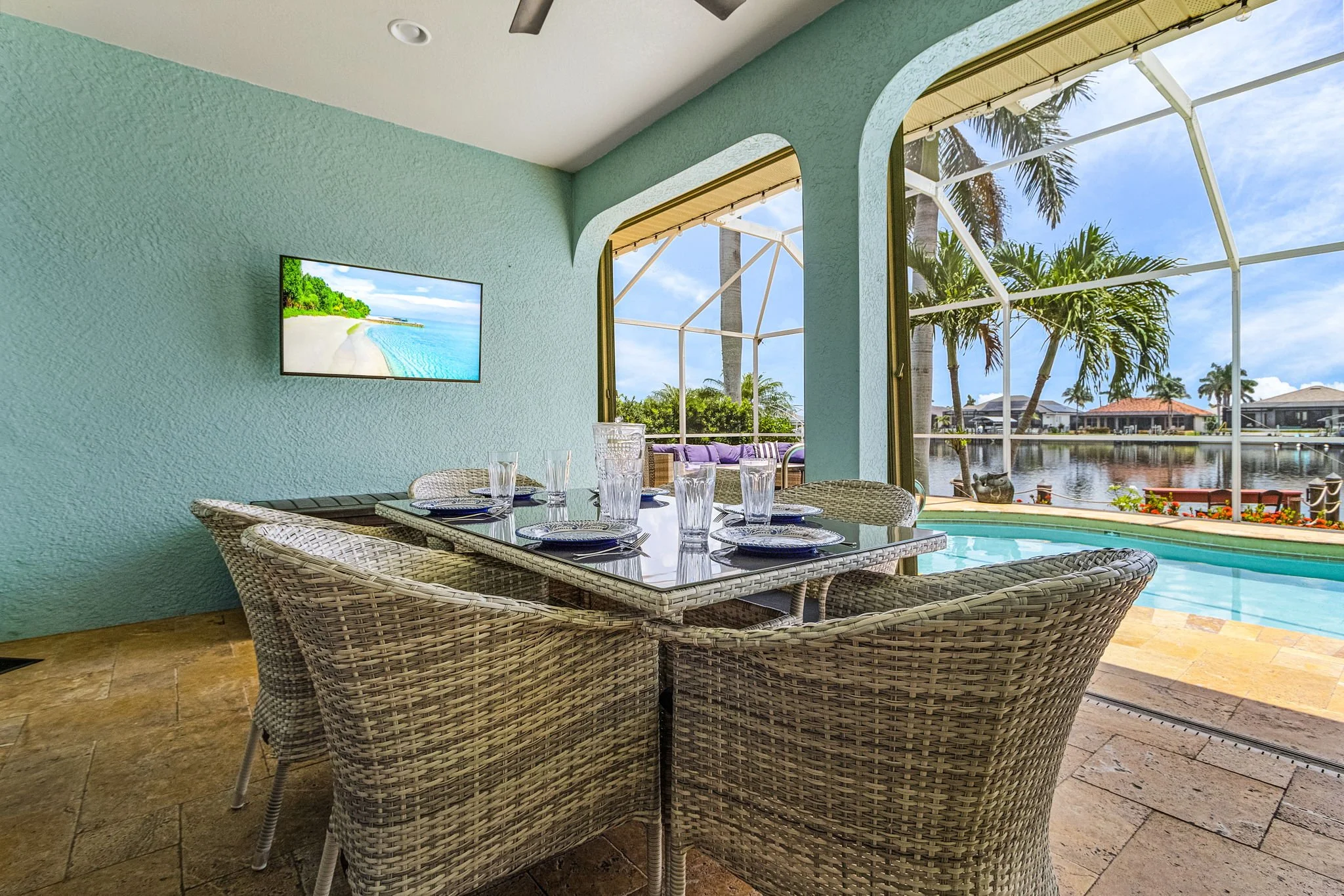 Indoor dining area with a glass-top table set with glasses and napkins. The room has turquoise textured walls and large screen TV. Large windows with views of palm trees, water, and a pool outside.