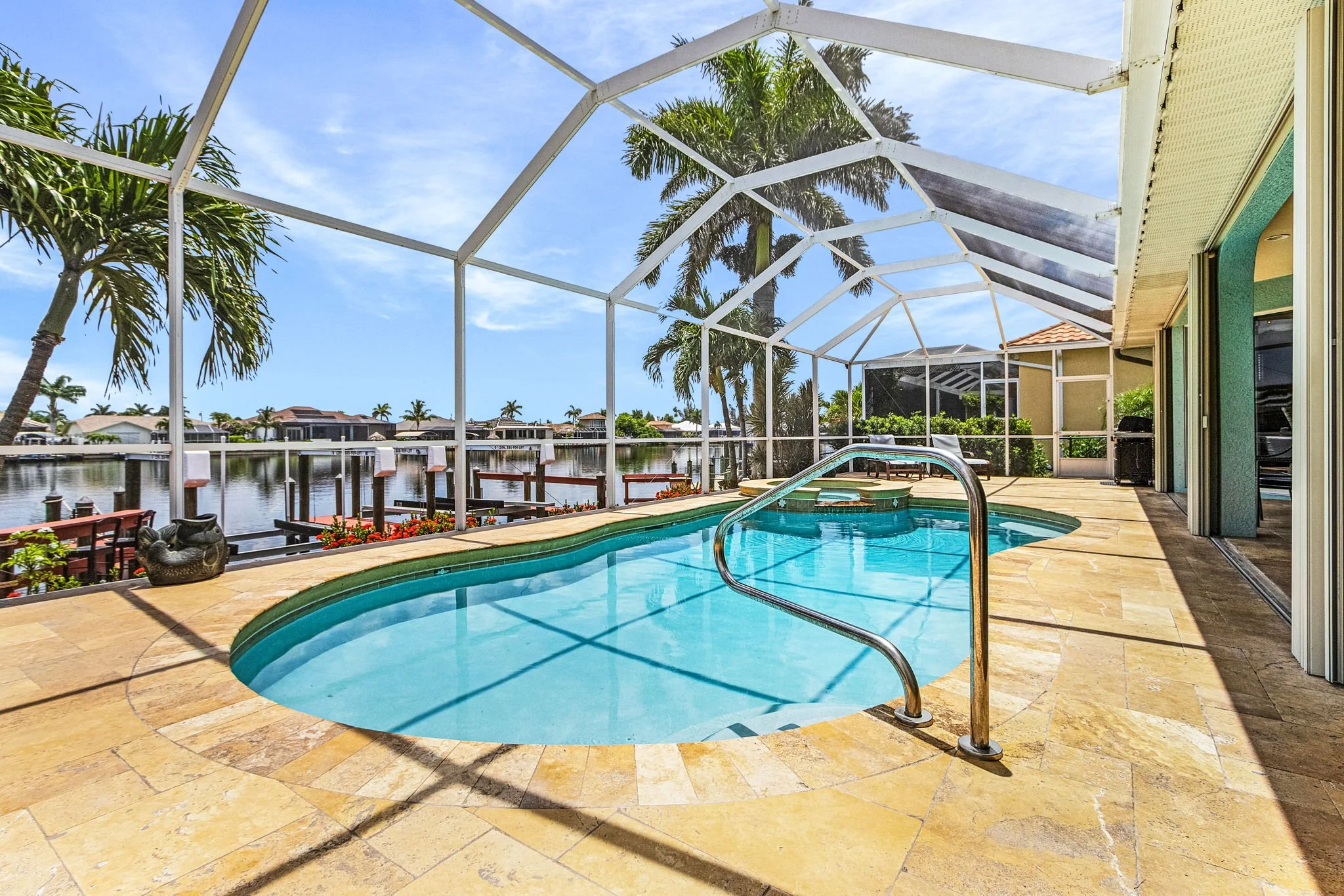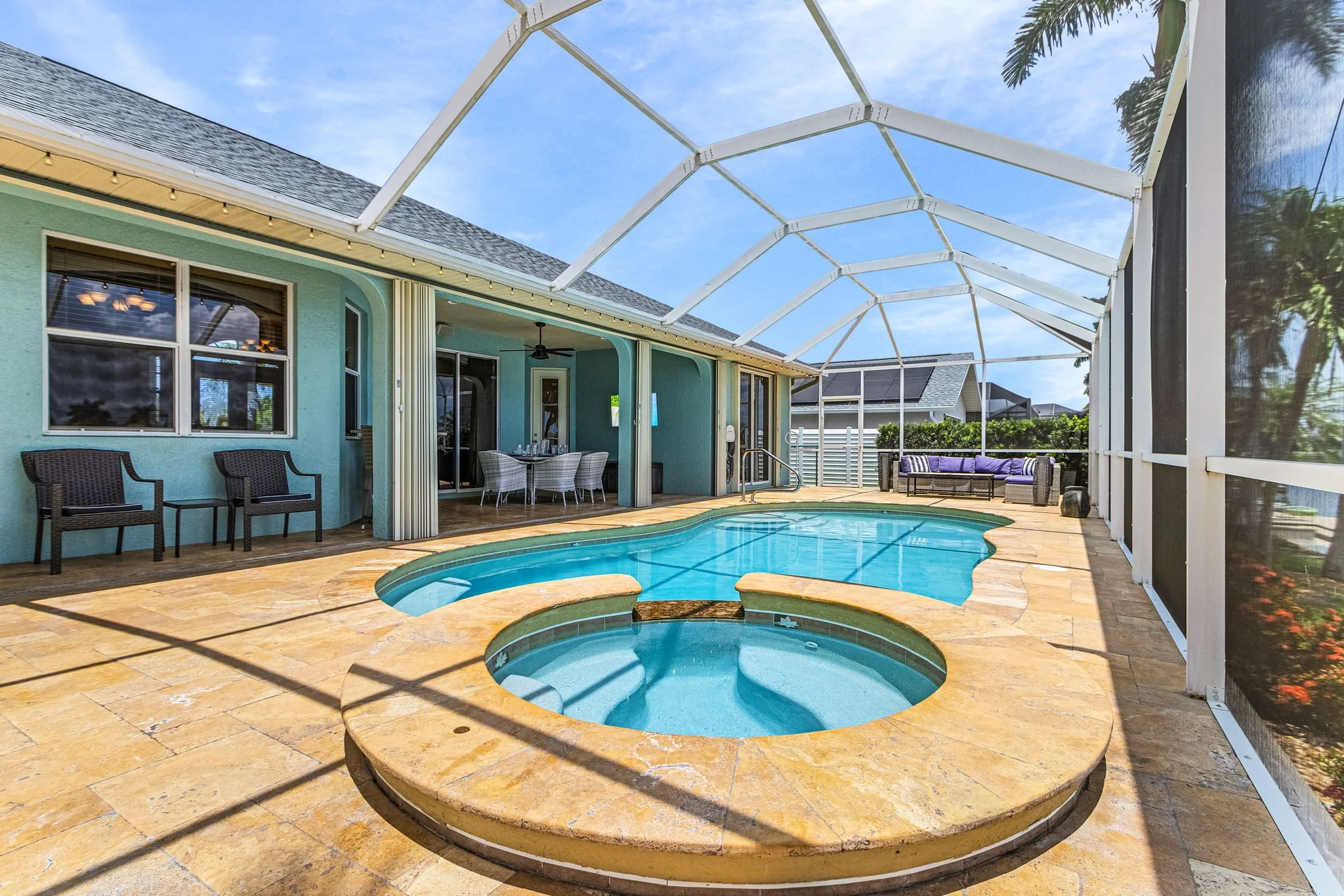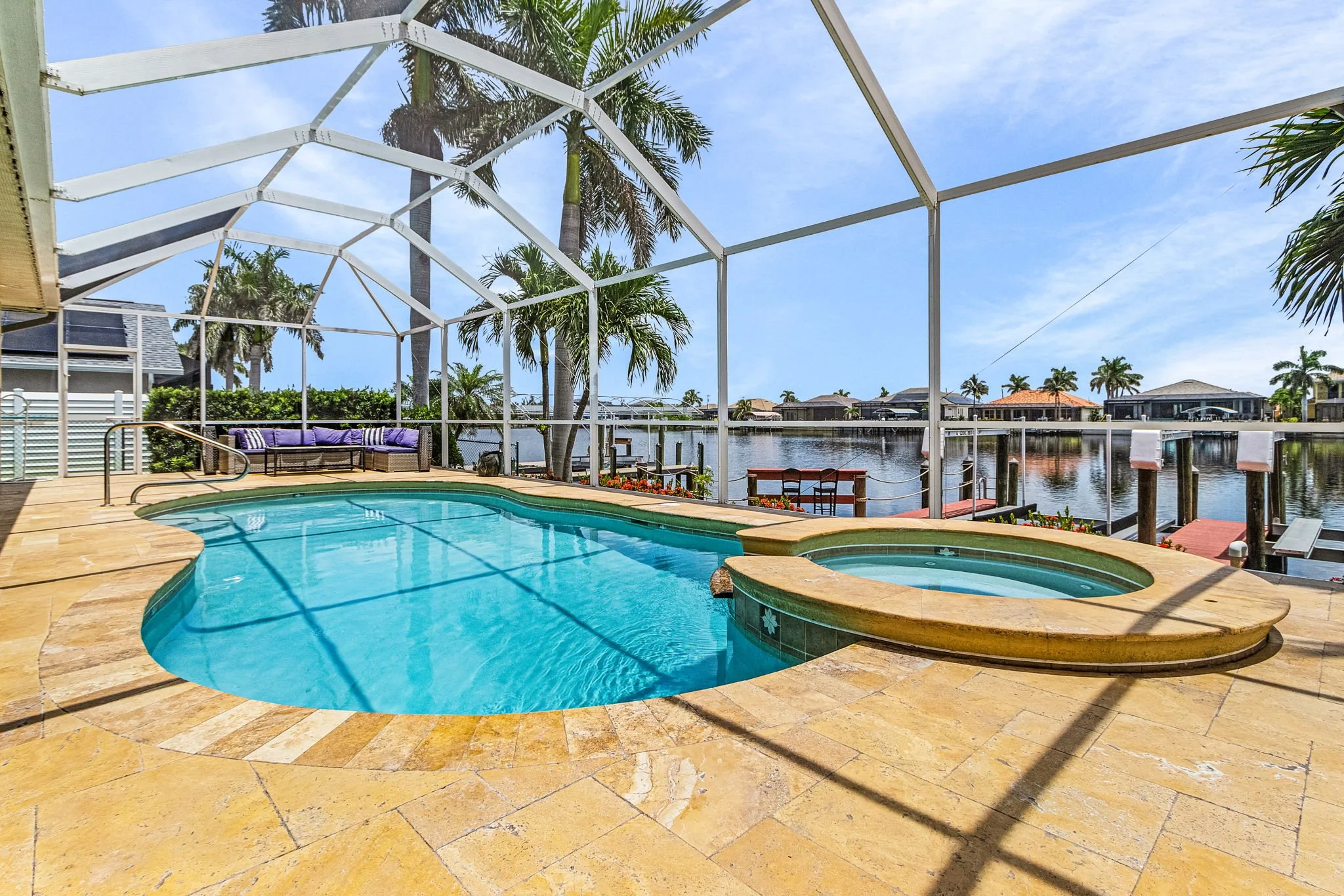 Pool and hot tub on a screened patio overlooking a canal with palm trees and houses.