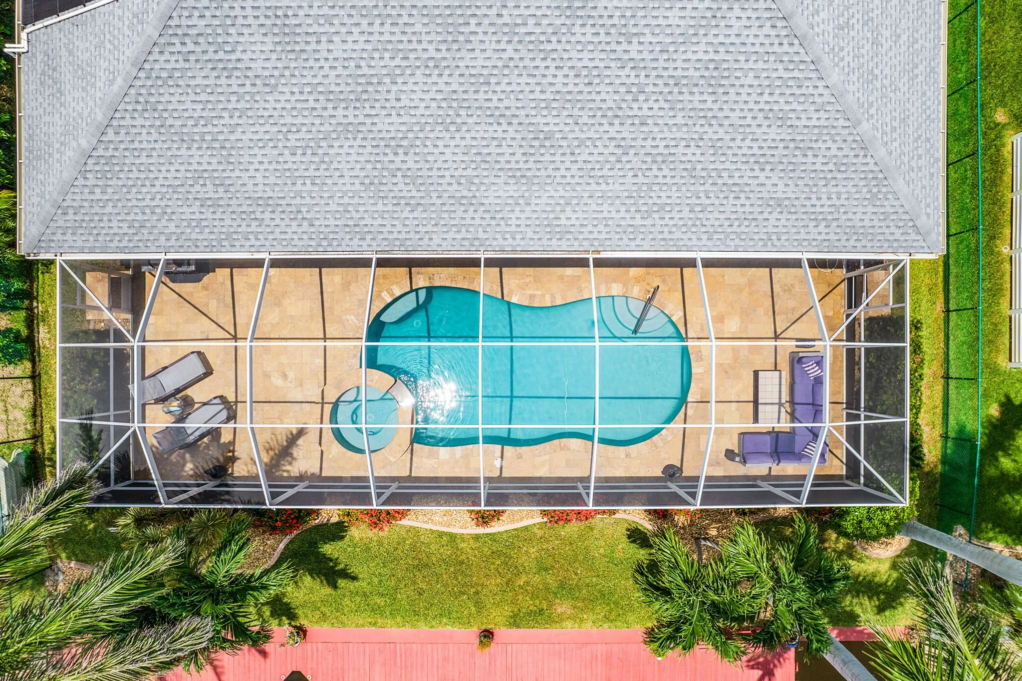A backyard enclosed by a screen, with a kidney-shaped swimming pool, poolside furniture including lounge chairs and a seating area, surrounded by greenery and palm trees.