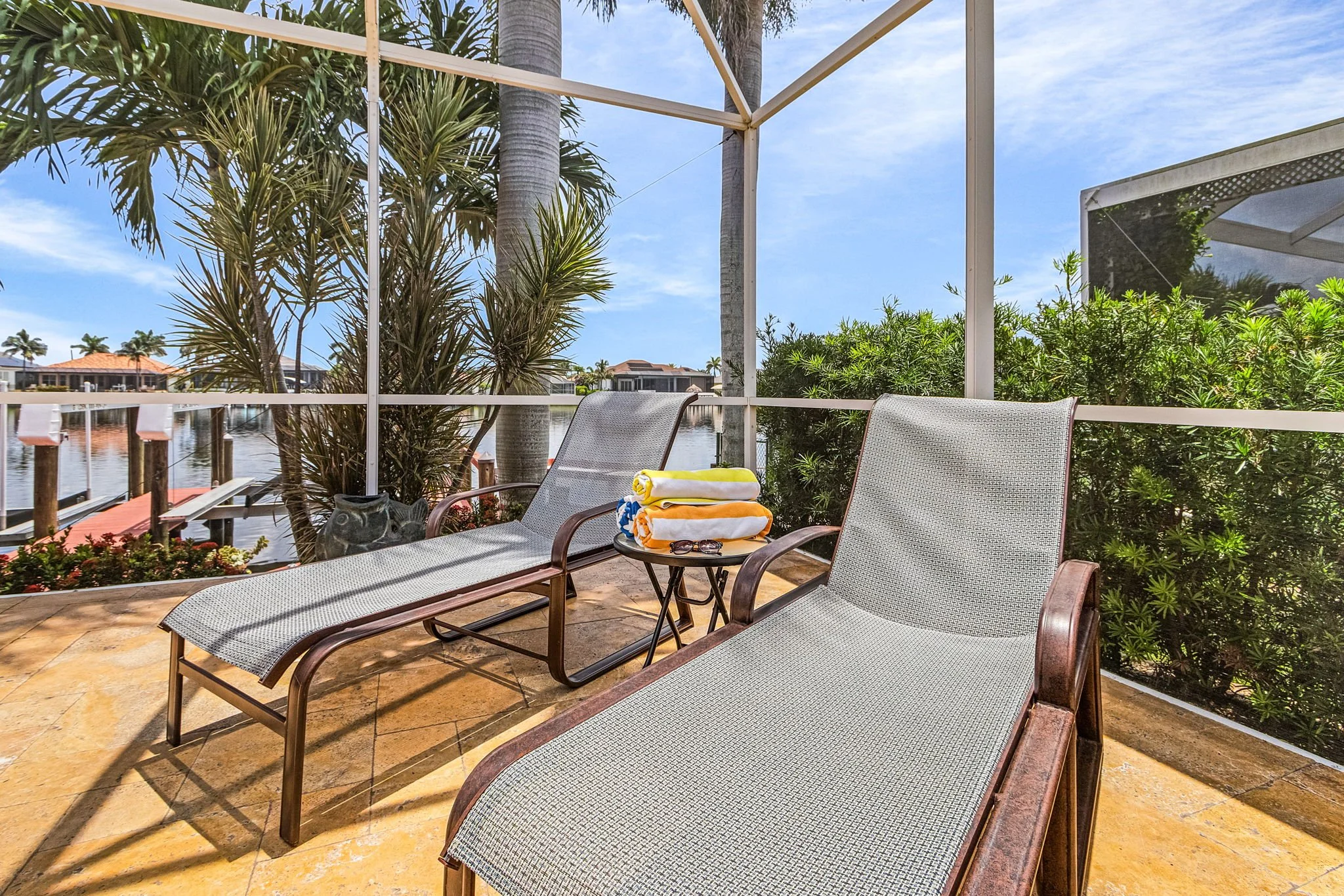 Two lounge chairs on a screened patio overlooking a waterway, with a small table holding towels and sunglasses between them, surrounded by trees and bushes, under a partly cloudy sky.